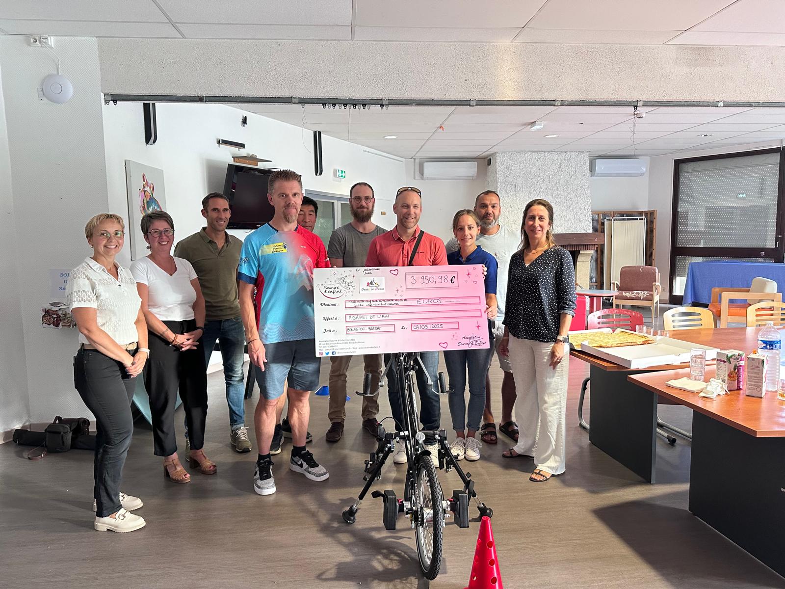 Mercredi 3 septembre, en présence de représentants de l’Adapei et du club du Grand fond bressan (GFB) a eu lieu une remise de chèque de 3 950 €, permettant de financer un handbike à destination de l’Adapei (Association départementale de parents et d’amis des personnes handicapées mentales). « Grâce à notre partenariat avec le GFB, plusieurs courses solidaires ont été organisées au fil des années, explique Layla Kaabèche (Sourire d’enfant). Les efforts collectifs des dernières courses (dont la corrida pédestre du 4 juillet) ont permis de récolter 406 €, qui ont en partie financer ce handbike. »